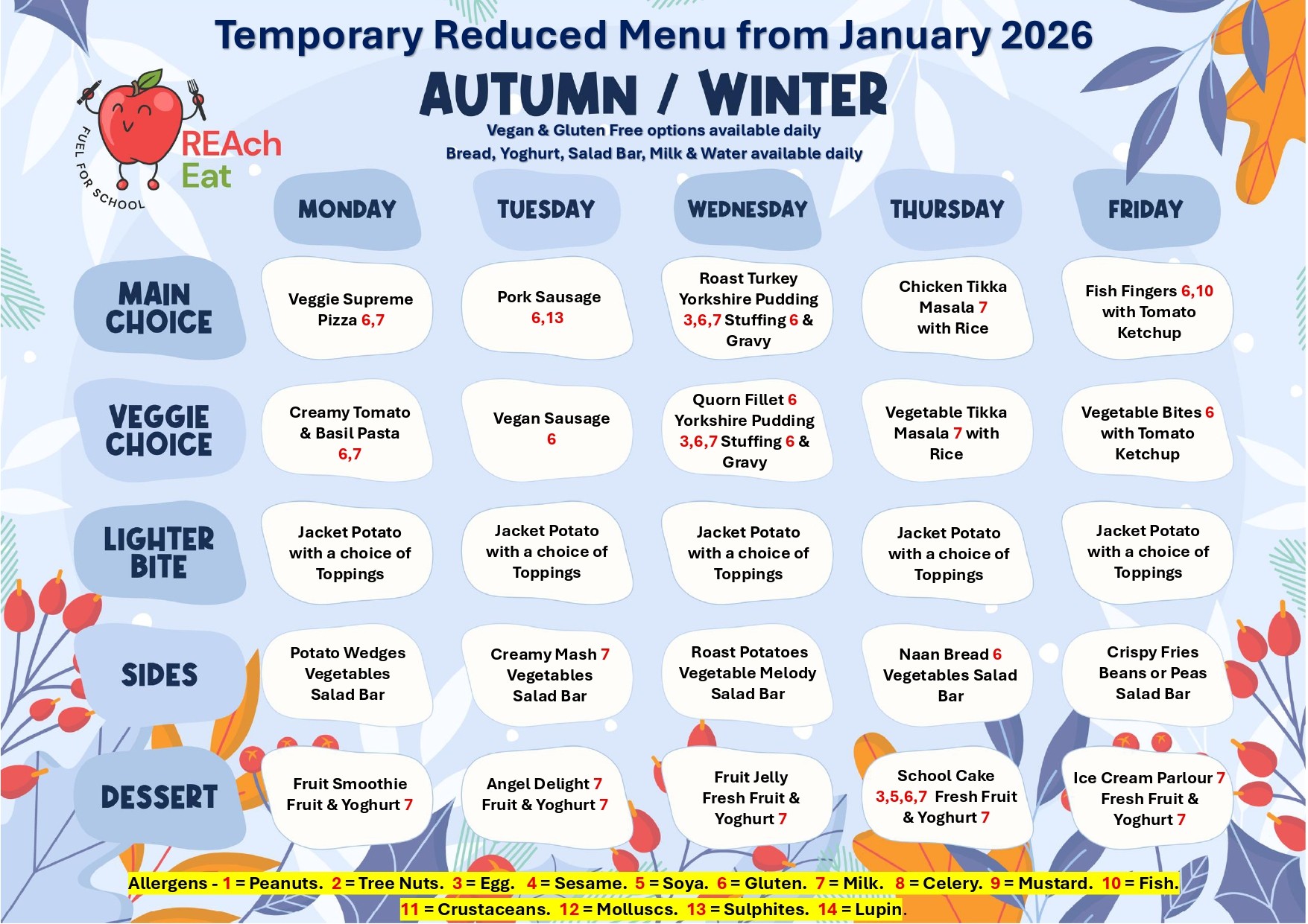 All of our meals are cooked on site using fresh, local produce by our catering team. Menus are available below for you to see the choice of meals offered and to help your child pick what they would like to eat.